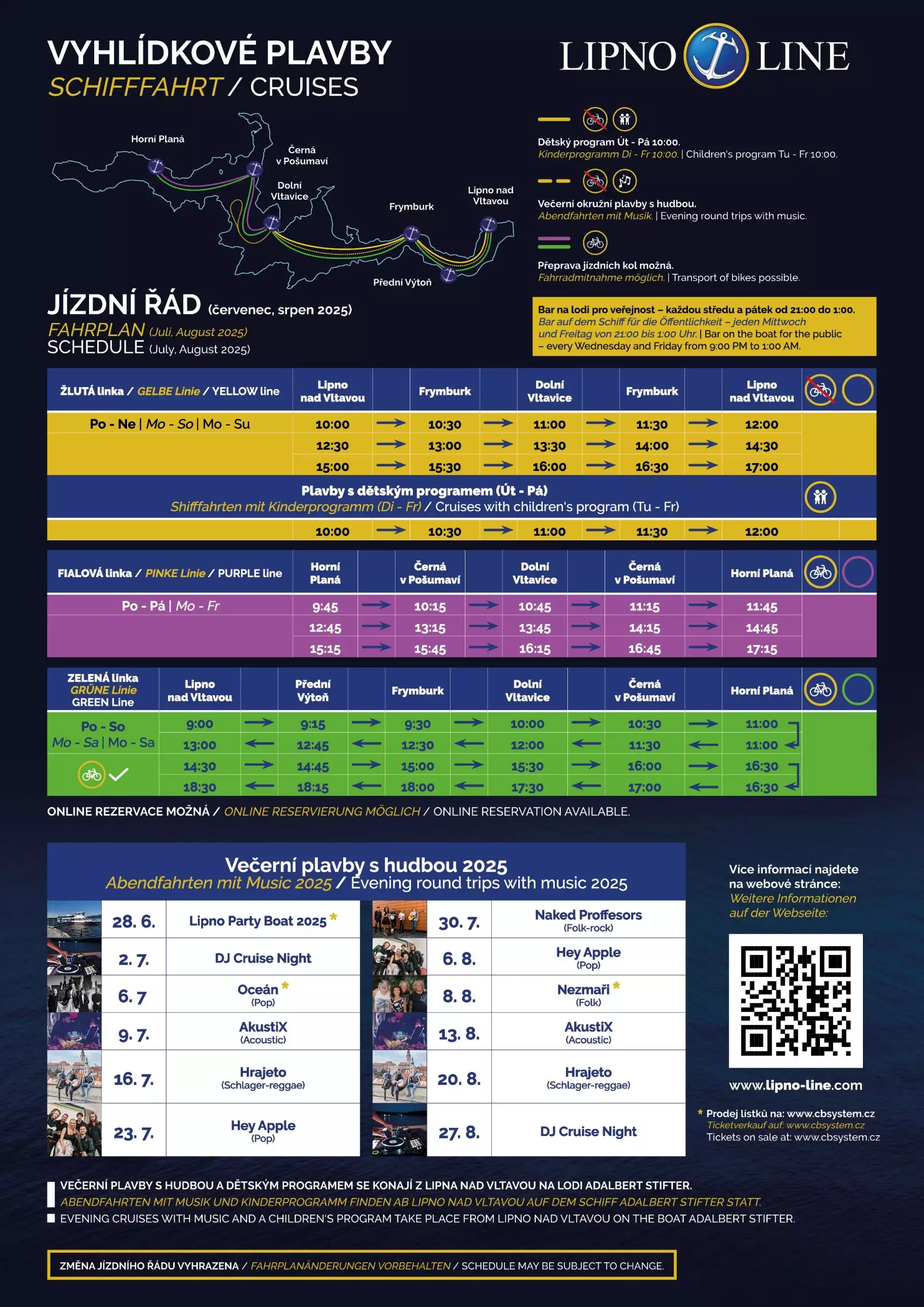 Der Sommer 2025 steht auf dem Lipno ganz im Zeichen von Schifffahrten, Sonne und guter Laune! Wir haben für Sie ein abwechslungsreiches Programm an Ausflugsfahrten vorbereitet – alle Infos finden Sie auf dem untenstehenden Plakat. Freuen Sie sich auf unsere beliebten Linienfahrten, Ausflüge und stimmungsvolle Abendfahrten.